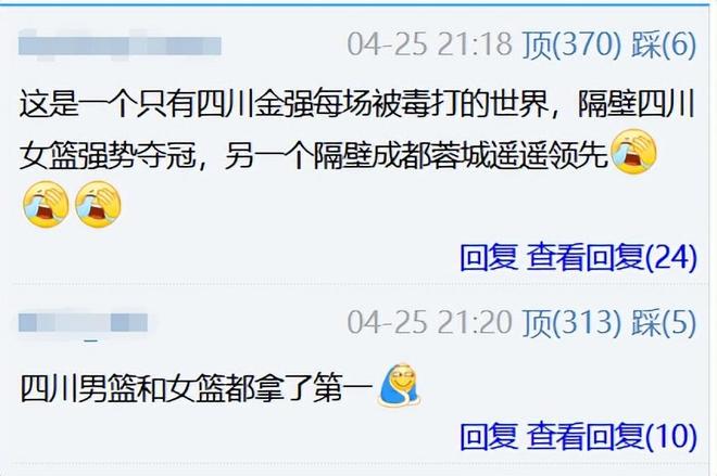 看完四川女篮的成功夺冠,赛后评论区球迷也是贡献了不少的精彩评论,在称赞女篮球员表现的同时,也有不少四川球迷借四川女篮的夺冠来嘲讽四川男篮,并且获得了不少点赞:这是一个只有四川金强每场被毒打的世界,隔壁四川女篮强势夺冠,另一个隔壁成都蓉城遥遥领先;四川男篮和女篮都拿了第一;四川男篮的脸,让四川女篮争取回来了,成都这个地方,说法真的是神奇!