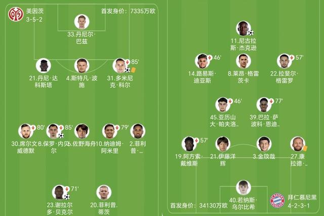 北京时间4月25日21点30分,25-26赛季德甲第31轮,第10的美因茨主场迎战拜仁,在上半场连进3球。